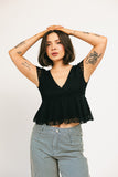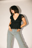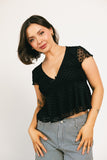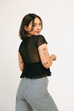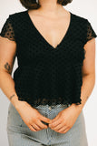 this short sleeve black top is sweet + feminine, but packs a punch. featuring a chic polka dot overlay, it has a babydoll shape with a flirty v-neckline. whether you dress it up for date night, or down for casual outings, it’s the perfect elevated basic for every season.