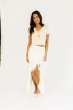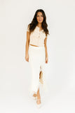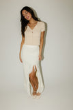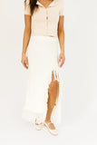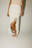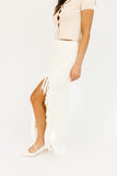 this sleek ivory maxi skirt serves some serious retro realness. featuring a flirty side slit with vintage-inspired fringe detailing, it’s the perfect not-so-basic maxi skirt for concerts, coffee dates, + girls nights out.