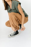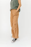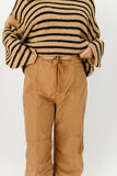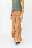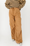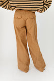 - camel // wide leg, one button zip fly, adjustable tie waist, pockets, drawstring hem