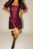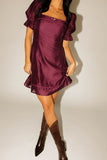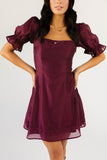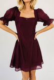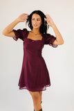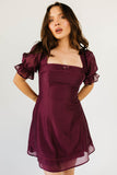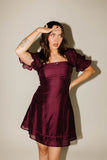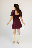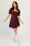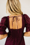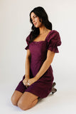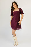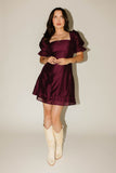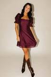 - plum // mini length, square neckline, puff sleeves, elastic cuffs, bow detail, lace trim detailing, back tie, smocked back, back zipper closure, lined