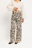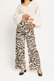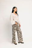 a total outfit gamechanger, these zebra printed jeans are giving ‘girls gone wild,’ but in a super chic way. featuring a sleek high-waisted fit + a raw hemline, they’re the perfect statement bottoms for any casual ensemble.