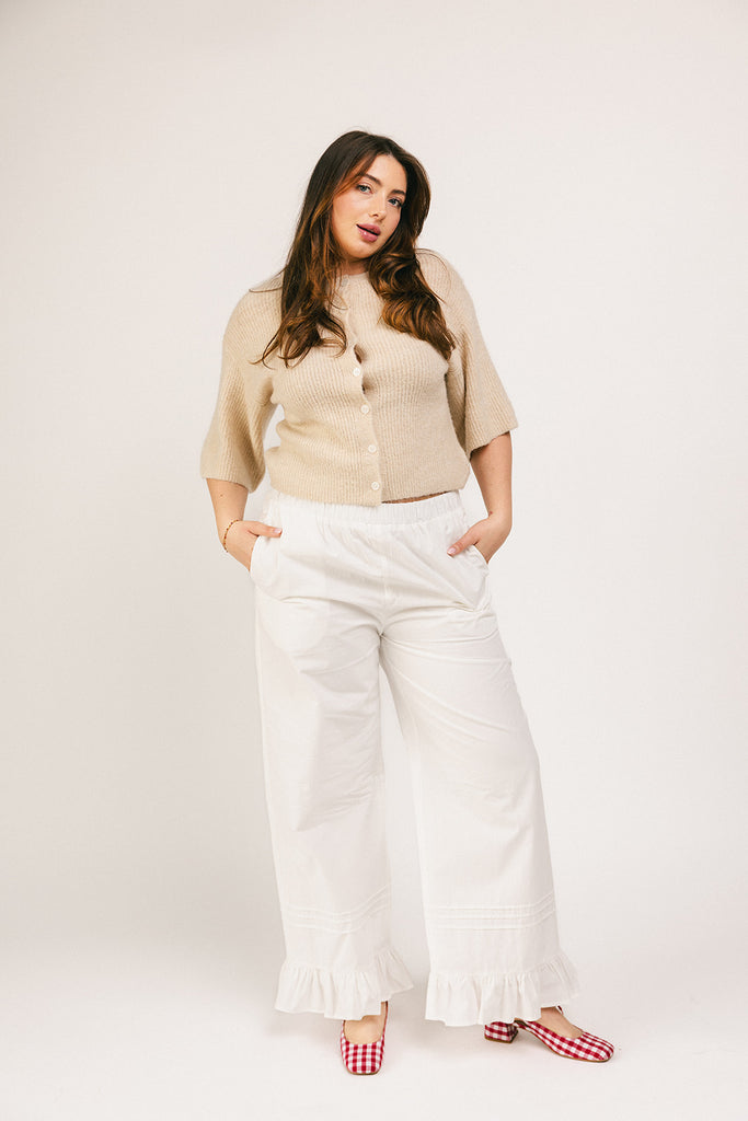 where cool meets comfort; these wide leg white pants were made to be dressed up or down for every season + situation. with a breezy silhouette + chic ruffled hem details, they add a hint of sweetness + style to any outfit. we love pairing them with sweaters, tanks, tees, + basically anything + everything we can.