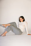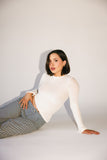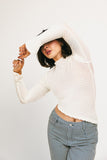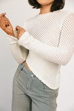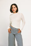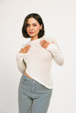 an elevated basic with an eye-catching twist, this long sleeve white top has a chic ruffled texture + a flirty asymmetric hemline. we love it paired with jeans + sneakers for date night or a mini skirt + heels for a trendy ‘going out’ look.