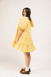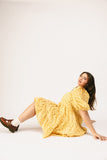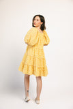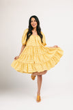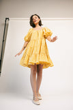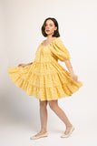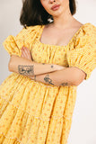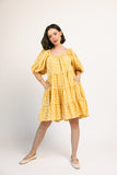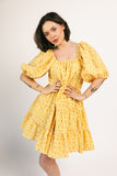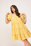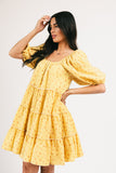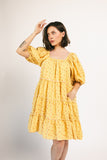 - sunshine // puff sleeves, knee length, tiered skirt, scoop elastic neckline, high low skirt, fully lined, pockets