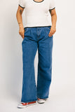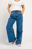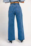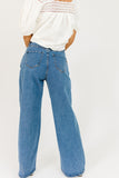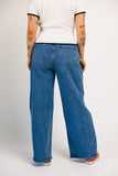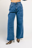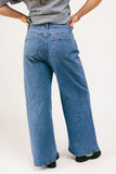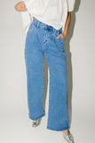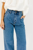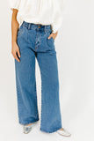 - medium stone // wide leg denim, one button zip fly, belt loops, pockets, pleat detailing