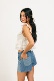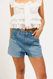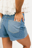 spice up any casual outfit with these vintage-inspired striped shorts. with their high rise silhouette, relaxed feel, + striped panel details, they’re the perfect denim shorts to pair with blouses, tees, + tanks.