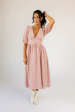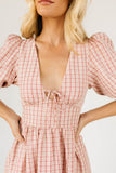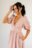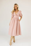 - pink plaid // midi length, deep v-neckline, puff sleeves, tie front detail, elastic cuffs, pockets, back zipper closure, lined throughout