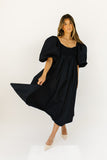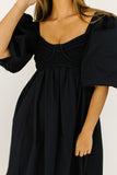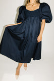 the navy blue puff sleeve dress of our dreams. the sweetheart neckline + corset-inspired bodice give it a romantic feel, while the balloon sleeves + full skirt add a sophisticated flair. it’s the perfect puff sleeve midi dress for formal dinners + anytime you feel like frolicking.