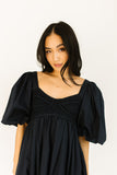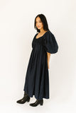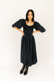 - navy // midi length, sweetheart neckline, smocked bodice, back zipper closure, balloon sleeves