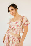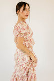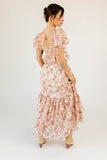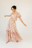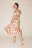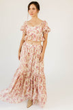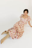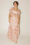 - cream pink floral // square neckline, cropped, elastic cuffs, smocked back, elastic shoulders, tie back, maxi length, elastic back waist, ruffle skirt, lined skirt