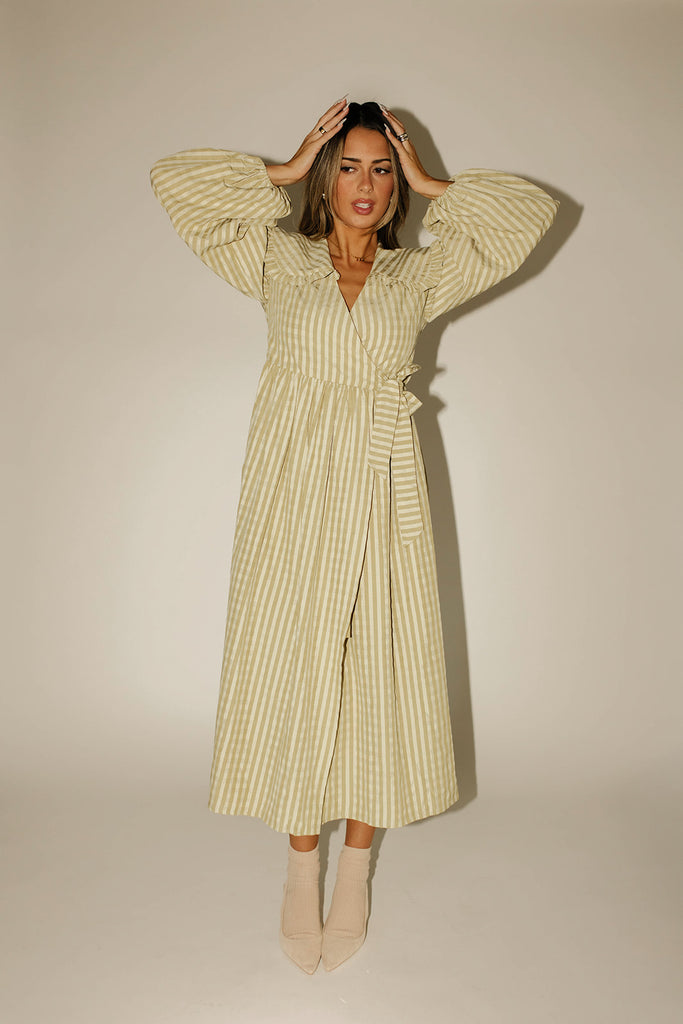 a maxi made for every season, this green gingham patterned wrap dress is a timeless essential. featuring a true wrap silhouette with a ruffled cape collar, this long sleeve maxi dress is a total attention magnet. a must-have for family pictures, bridal showers, + everything in between, we love it paired with knee high boots in the fall // winter + dainty heels in the spring // summer.