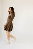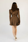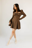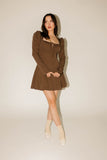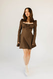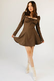 the brown long sleeve mini dress of our dreams. it features a chic square neckline with a cinched tie detail, as well as a fitted corset-style waistline, + a flirty flared skirt. the perfect fall // winter mini dress for date nights, holiday dinners, + everything in between.