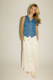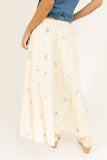 this vintage-inspired maxi skirt will turn any spring outfit into an on-trend moment. featuring that iconic 90s // y2k tiered silhouette, this ivory maxi skirt has the cutest embroidered floral details. a must-have for picnics, brunches, + any semi-casual outing.