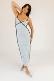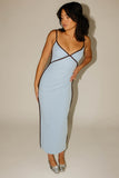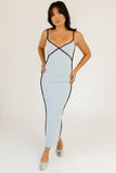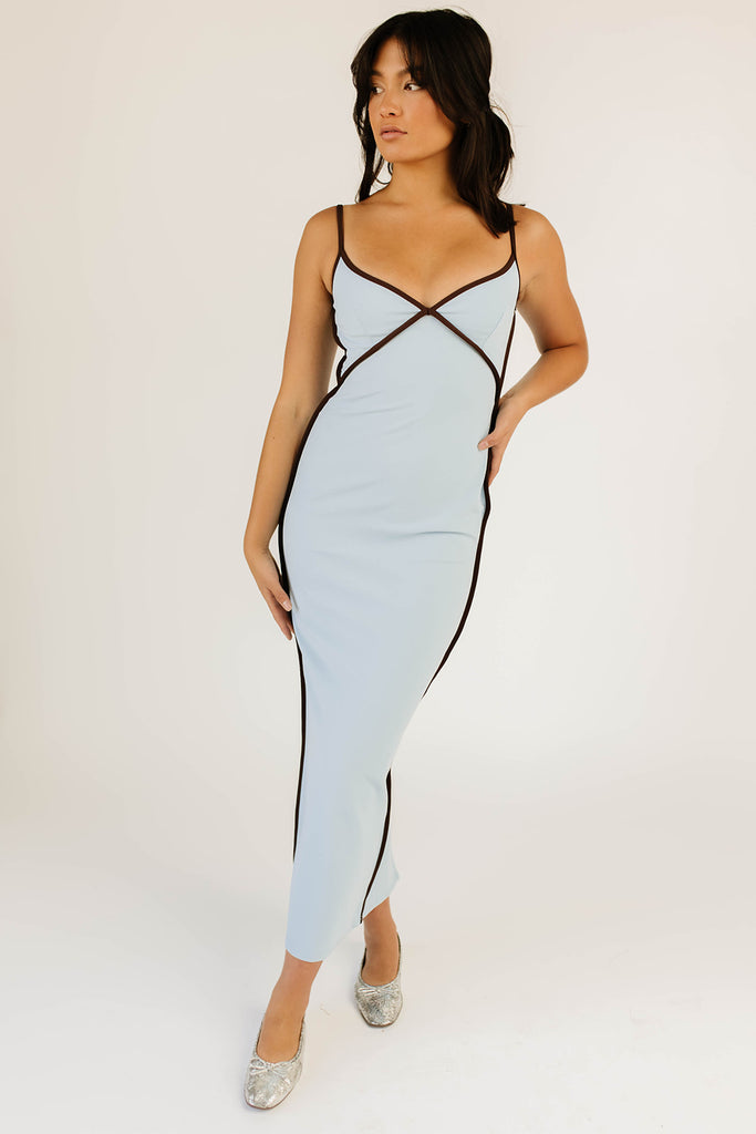 enter your flirty fairytale era with this baby blue bodycon midi dress. with its sultry v-neckline + sleek brown seam detailing, this 90s // y2k-inspired dress was made for summer parties, dinner dates, + going out with the girlies. we love it dressed up with strappy heels, or down with ballet flats.