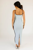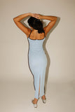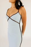- baby blue + brown trim // maxi length, sweetheart neckline, seam detailing, back slit, lined chest, back zipper closure, adjustable straps