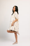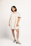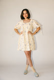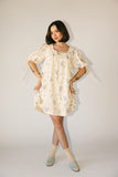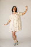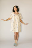 - bunnies // mini length, scoop neckline, ruffle neckline, pleated detail front + back, puff sleeves, elastic cuffs + adjustable ties, lined