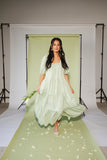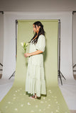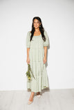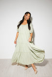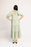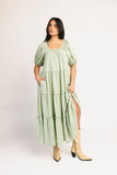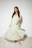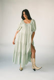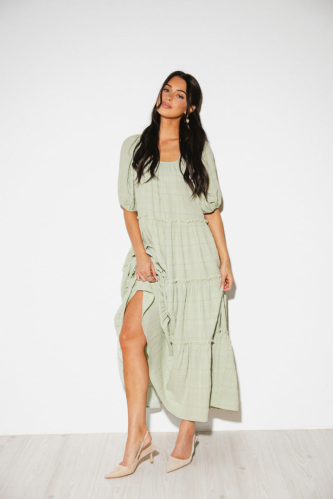 - mint // maxi length, puff sleeve, tiered skirt, elastic scoop neckline, lined, textured fabric, pockets