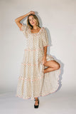 - polka dot + off white base // maxi length, lined, puff sleeve, tiered skirt, elastic scoop neckline, pockets, pink ruffle details