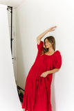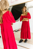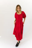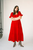 - poppy red // maxi length, puff sleeve, tiered skirt, elastic scoop neckline, pockets