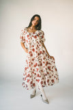 - red floral + off white base // maxi length, lined, puff sleeve, tiered skirt, elastic scoop neckline, pockets