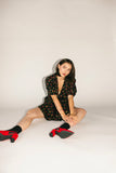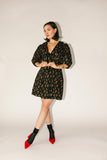 a black floral beauty, this vintage-inspired mini dress will take you from day to night, season after season. with its feminine puff sleeves + flirty v-neckline, it’s the perfect combination of sultry + sophisticated. a must-have for weddings, brunch dates, + dinner parties.