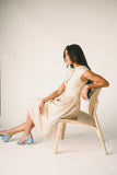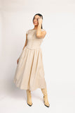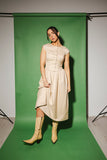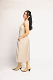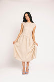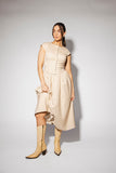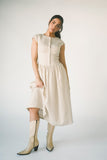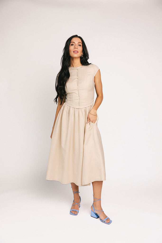 - natural // midi length, scoop neckline, pockets, lined throughout, working buttons, hidden snap buttons, side zipper