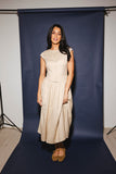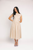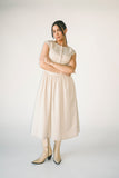 vintage in spirit, iconic in practice. this zoco exclusive short sleeve midi dress features a fitted button-up bodice + a classic a-line skirt. with its chic silhouette + neutral tone, it’s the perfect vintage-inspired dress for family pictures, bridal showers, weddings, + beyond.