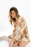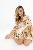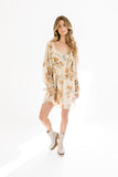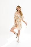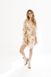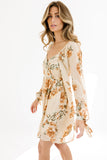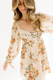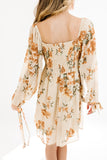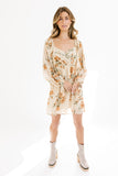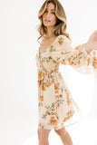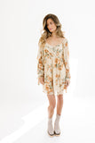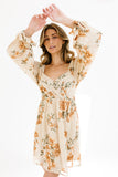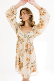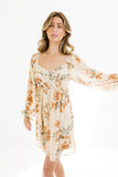 - cream multicolor floral // mini length, sweetheart neckline, button fastener, smocked back, fully lined, balloon sleeves, bow cuffs