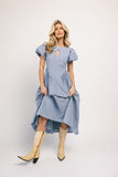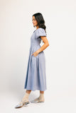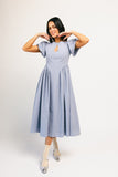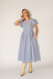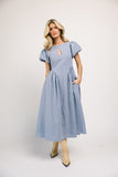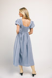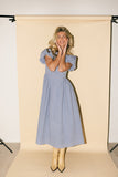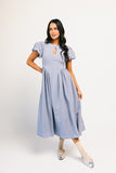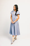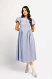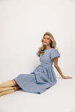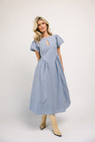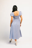 - dusty blue // midi length, scoop neckline, basque waist, keyhole detail, front shell button closure, puff sleeves, elastic cuffs, smocked back panel, back zipper closure, lined throughout, pockets