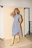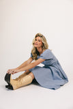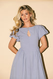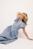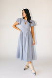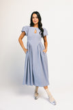 a timeless beauty, this dusty blue puff sleeve midi dress gives classic romance with a flirty twist. its vintage-inspired silhouette features a chic keyhole cutout, + a feminine bodice that snatches just right. the perfect dress for date nights, garden parties, weddings, + more.