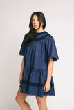 - navy // mini length, scoop neckline, flutter sleeves, tiered, back zipper, lace trim details