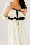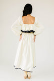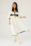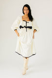 - cream + navy // midi length, square neckline, lined bodice, elastic shoulders, non-adjustable front tie, back zipper closure, elastic cuffs, navy trim detailing