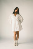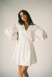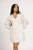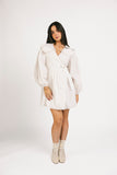 so, you need a little white dress that works for every season? featuring a vintage-inspired silhouette, this long sleeve white mini dress will take you from fall family pictures to spring garden parties. the long balloon sleeves + a scalloped peter pan collar give ‘prairie princess’ while the side tie + short length give ‘everyday slay.’ the perfect wrap dress to pair with boots, flats, + everything in between.