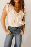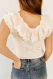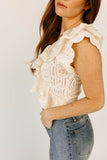 summer called + said you needed a cute ruffled crochet top. featuring dainty flutter sleeves + vintage-inspired lace details, it’s the perfect top for summer date nights, beachy vaycays, + everything in between. dress it up with a maxi skirt + heels, or down with shorts + sandals.