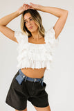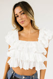 full of euro summer energy, this white ruffled crop top is guaranteed to be your new go-to. featuring a square neckline, fluttery short sleeves, + a cropped tiered silhouette, it’s the perfect top to pair with high-waisted shorts, maxi skirts, + linen pants all season long. a must-have for beach days, dinner dates, + all of your vacation outfits.