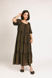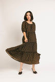 - mocha base + cream polka dot // maxi length, puff sleeve, tiered skirt, elastic scoop neckline, lined, pockets
