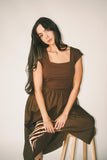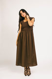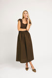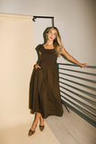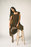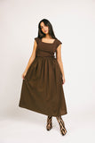 - chocolate // midi length, square neckline, adjustable tie sides, lined to knee, double lined bodice, pockets, elastic waistband