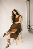 a must-have for every season, this chocolate brown midi dress features trendy cinch ties at the bodice that slim + snatch in all the right ways. the dainty a-line silhouette adds a hint of sophistication, while the sleek short sleeves keep things semi-casual. the perfect dress to take you from day dates to evening soirées.