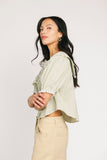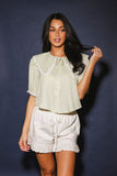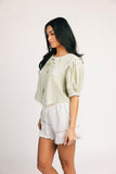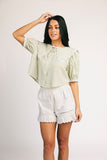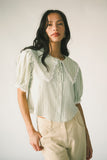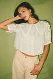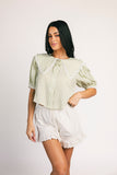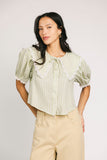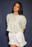 - sage stripes // collared, flower buttons, puff sleeves, elastic cuffs, front tie, crochet trim around collar + cuffs, rounded hem