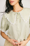 the vintage-inspired piece of our dreams, this pastel puff sleeve top is full of styling possibilities. featuring a soft pinstripe pattern + a bold lace trim collar, it’s a timeless classic that still packs a punch. whether you dress it up for the office or down for everyday errands, it’s an easy top you’ll reach for year-round.