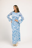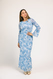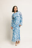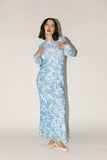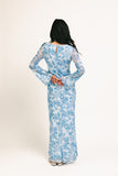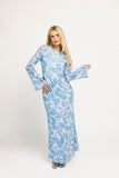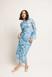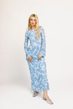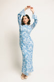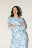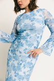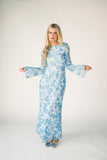 - blue // maxi length, crew neckline, floral mesh overlay, fully lined, sheer bell sleeves, keyhole back button closure, lettuce hem