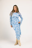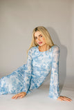 be on your boldest behavior with our zoco exclusive be right there mesh dress. with its stretchy mesh material + flared long sleeves, this y2k-inspired blue floral maxi dress is perfect for dinner dates, cocktail parties, + girls' nights out.