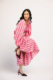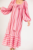 super girlie + ultra chic, this long sleeve striped maxi dress is full of styling possibilities. its bold pink + red striped pattern makes a statement, while its flowy silhouette offers tons of versatility. dress it up with heels for date night, or down with flats for casual outings.