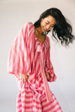 - pink + red // maxi length, elastic neckline, adjustable tie front, dramatic balloon sleeves, elastic cuffs, lined to thigh