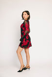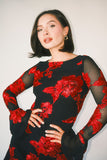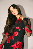 femme fatale, but make it wearable. this black long sleeve mini dress features moody red floral embellishments on a jaw-dropping silhouette. with its flirty length + fiery color combo, it’s the perfect dress for date nights, dinner parties, + anything that calls for drama.