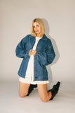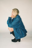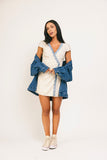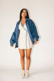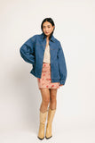 - denim // collared, working pockets, front zipper closure, drop shoulder, cuffed, distressing throughout