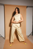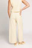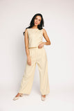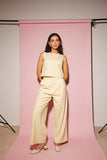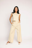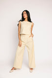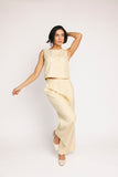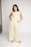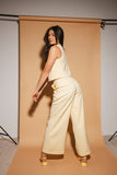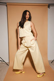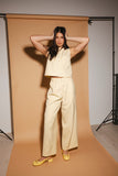 - butter yellow // scoop neckline, slightly cropped, fabric buttons, darts, high waisted, wide leg, belt loops, one button fly zip, french fly button, side pockets, faux back pocket, pleats, bonded lining top + pant