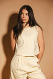 timeless, iconic, + beautifully unbothered, this butter yellow set means business... but also brunch. featuring a chic button-up tank + sleek high-waisted trousers, it’s the kind of elevated set that’ll take you from meetings to martinis without missing a beat. a must-have for office days, dinner dates, + everything in between.