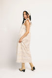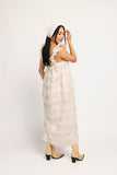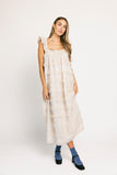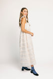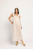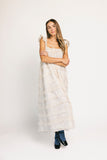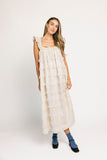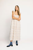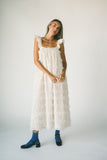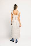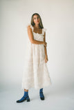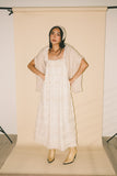 - off white // maxi length, square neckline, flutter sleeves, eyelet fabric, lace trim detailing, lined, pockets, front tie, elastic neckline
