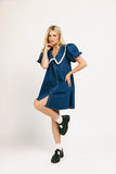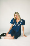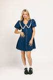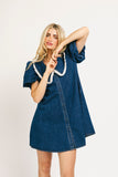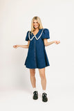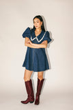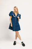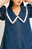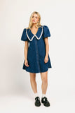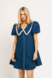 - denim darling // mini length, v-neckline, puff sleeves, peter pan collar w/ eyelet ruffle, buttons, pockets
